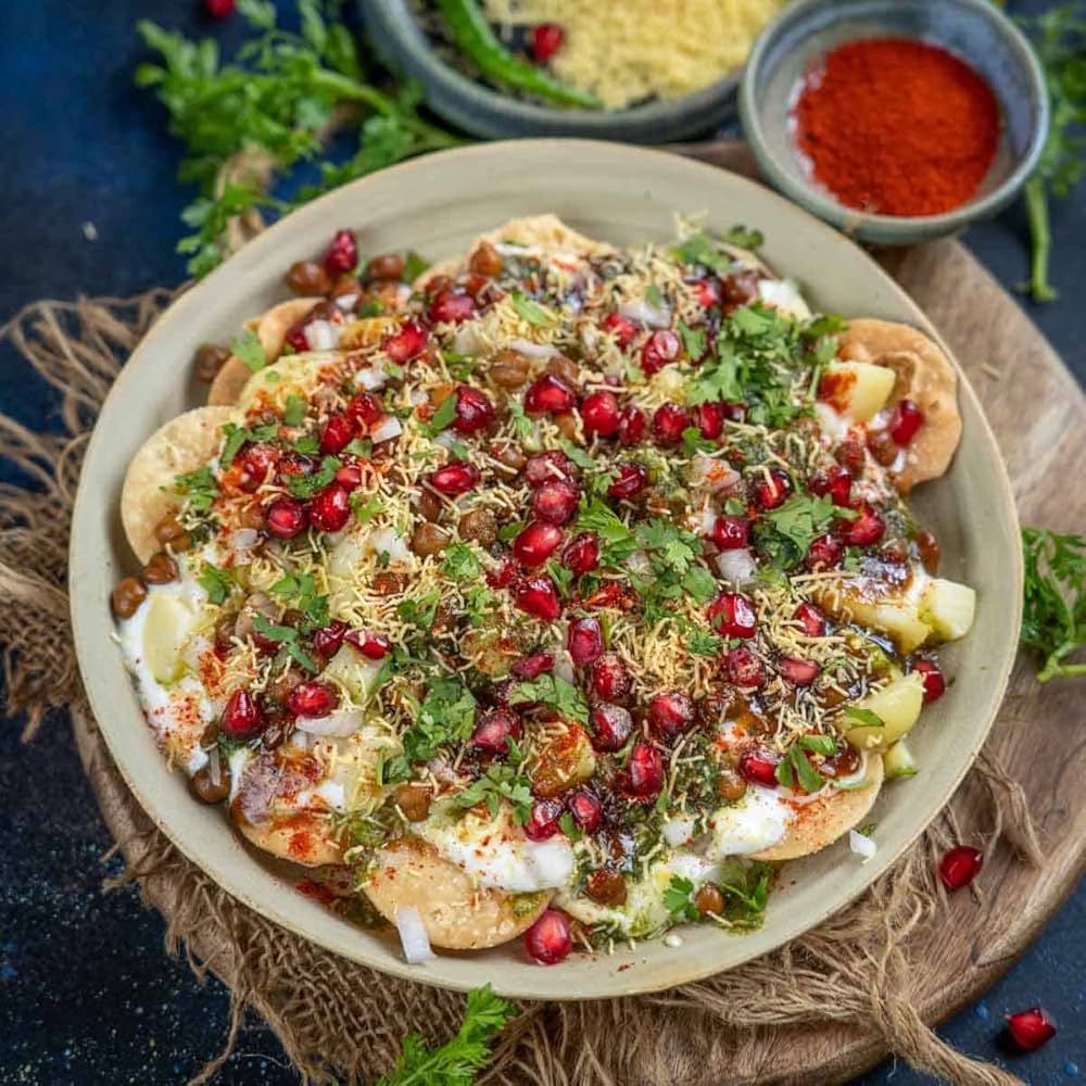 A popular Indian fast food that combines crispy wafers with tangy, spicy, and savory flavors. Topped with sweet chutneys, creamy yogurt, and spices for an extra kick.