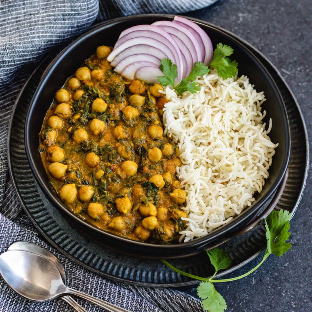 The Chole Rice Bowl is a hearty and wholesome combo of fluffy basmati rice topped with spicy, flavorful chickpea curry.
