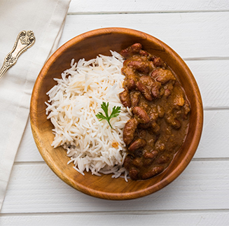 Featuring soft kidney beans simmered in a spiced tomato gravy, served over a bed of steamed rice.