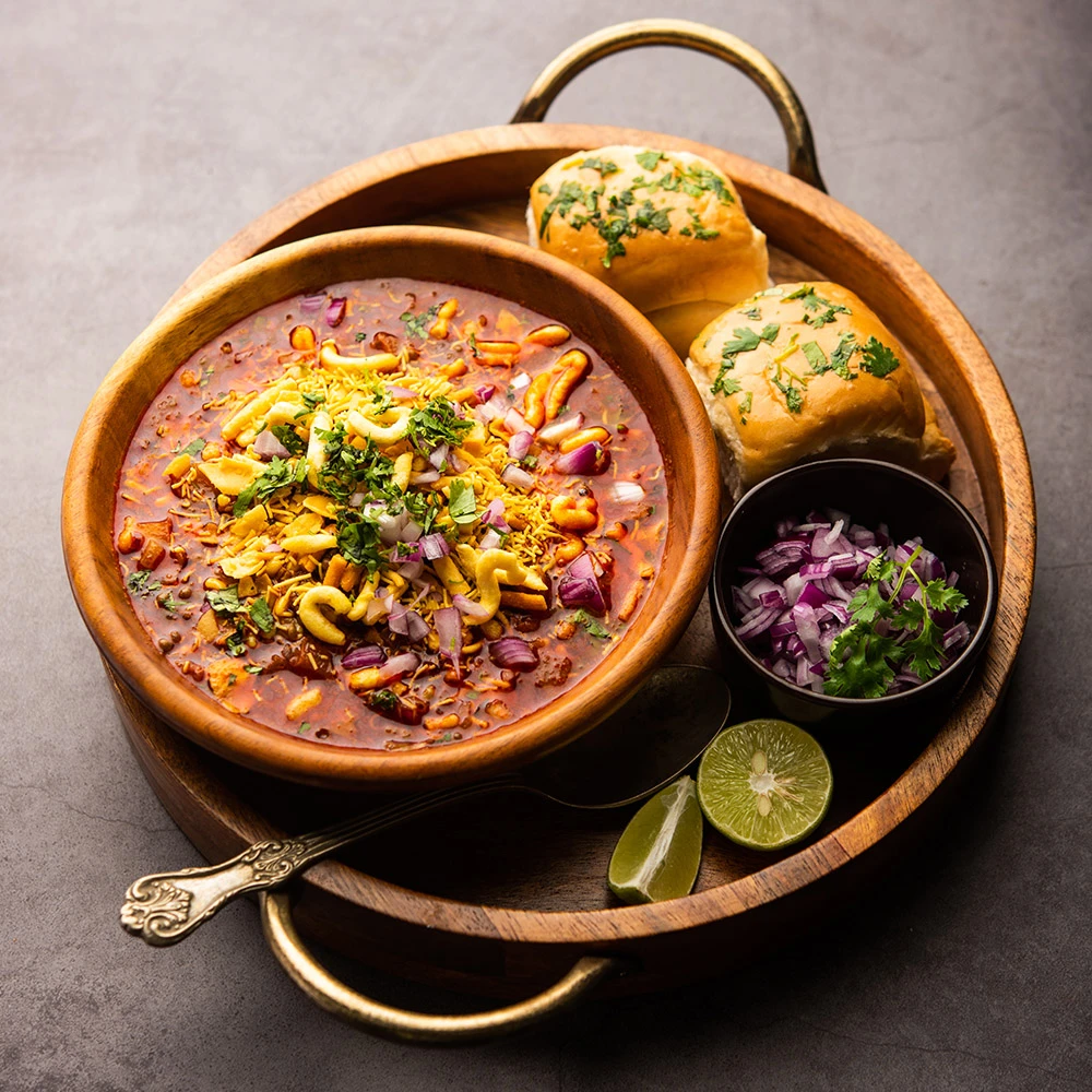 It’s a spicy Gujarati fast food dish with dried pea curry, crispy sev, onions, and fresh herbs, offering a tangy, flavorful mix of textures and spices.