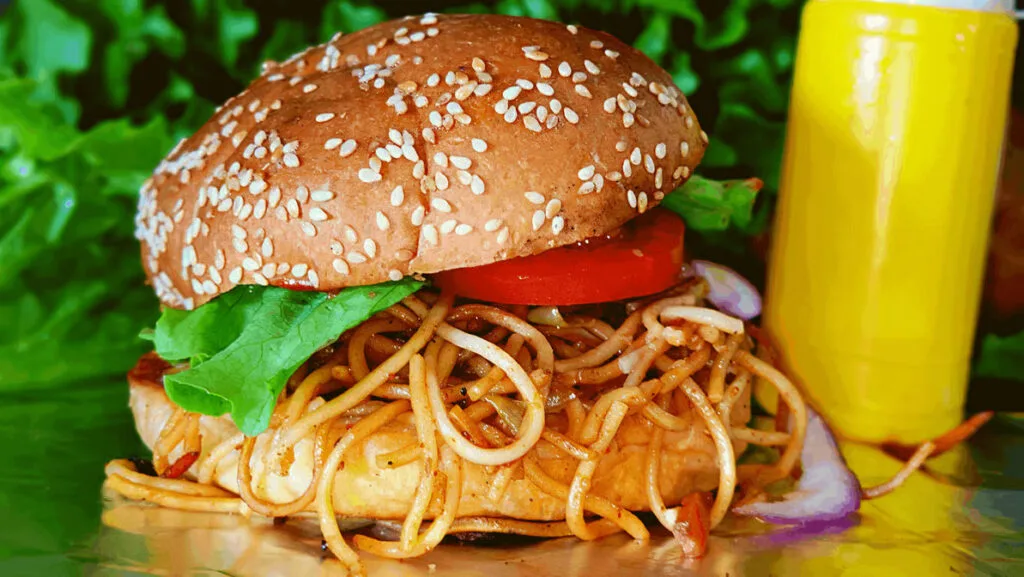 It features a crispy aloo tikki layered with spiced stir-fried noodles, fresh onions, tomatoes, and lettuce, all tucked inside a soft, toasted bun.